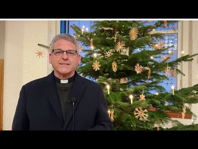 Father Christian Enke presents the parish's gift to members of the congregation at Christmas Masses in 2024: a small wooden cross as an object for meditation on the need for peace and Jesus Christ's presence in the world. (Click on the "Inhalt anzeigen" button to activate the video.)